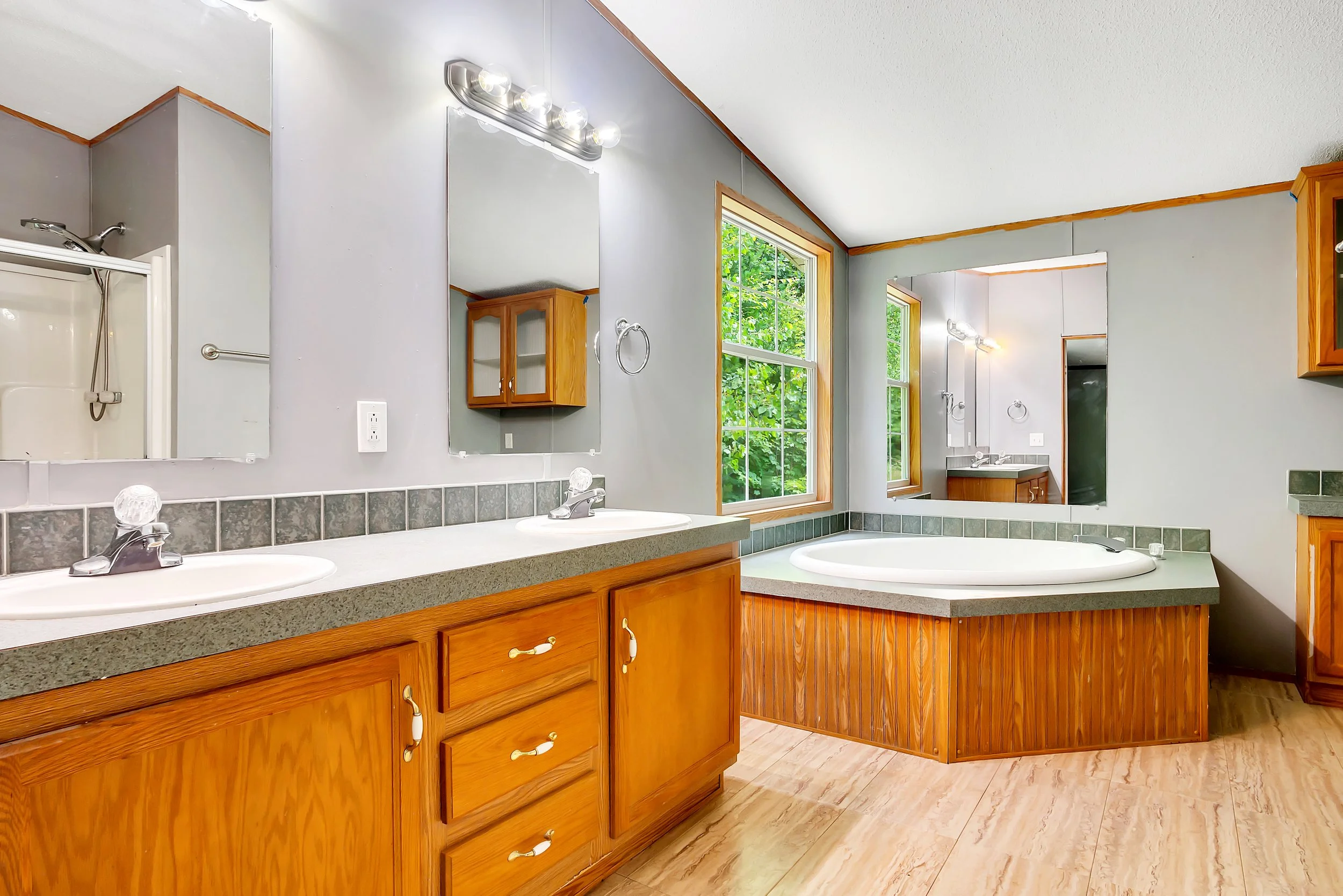 The home, complete with central air, features three comfortable bedrooms including an expansive primary ensuite with a deep soaking tub. Each bedroom exudes a sense of serenity that allows for a peaceful night's rest. Natural light filters through the windows, illuminating the rooms and creating a connection with the surrounding nature. The home ensures convenience and comfort for all occupants. Modern fixtures and soothing colors enhance the sense of relaxation, transforming daily routines into moments of serenity.